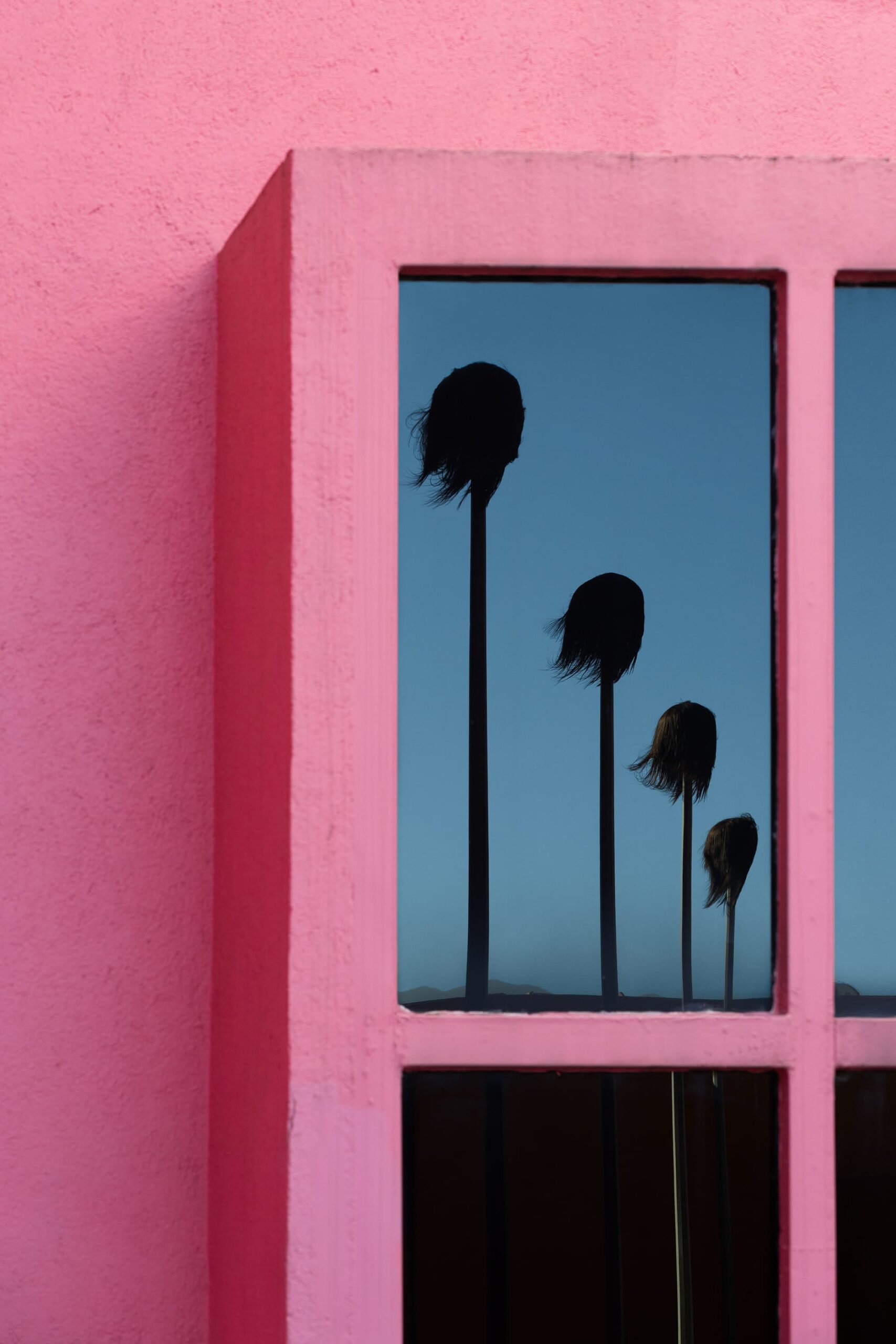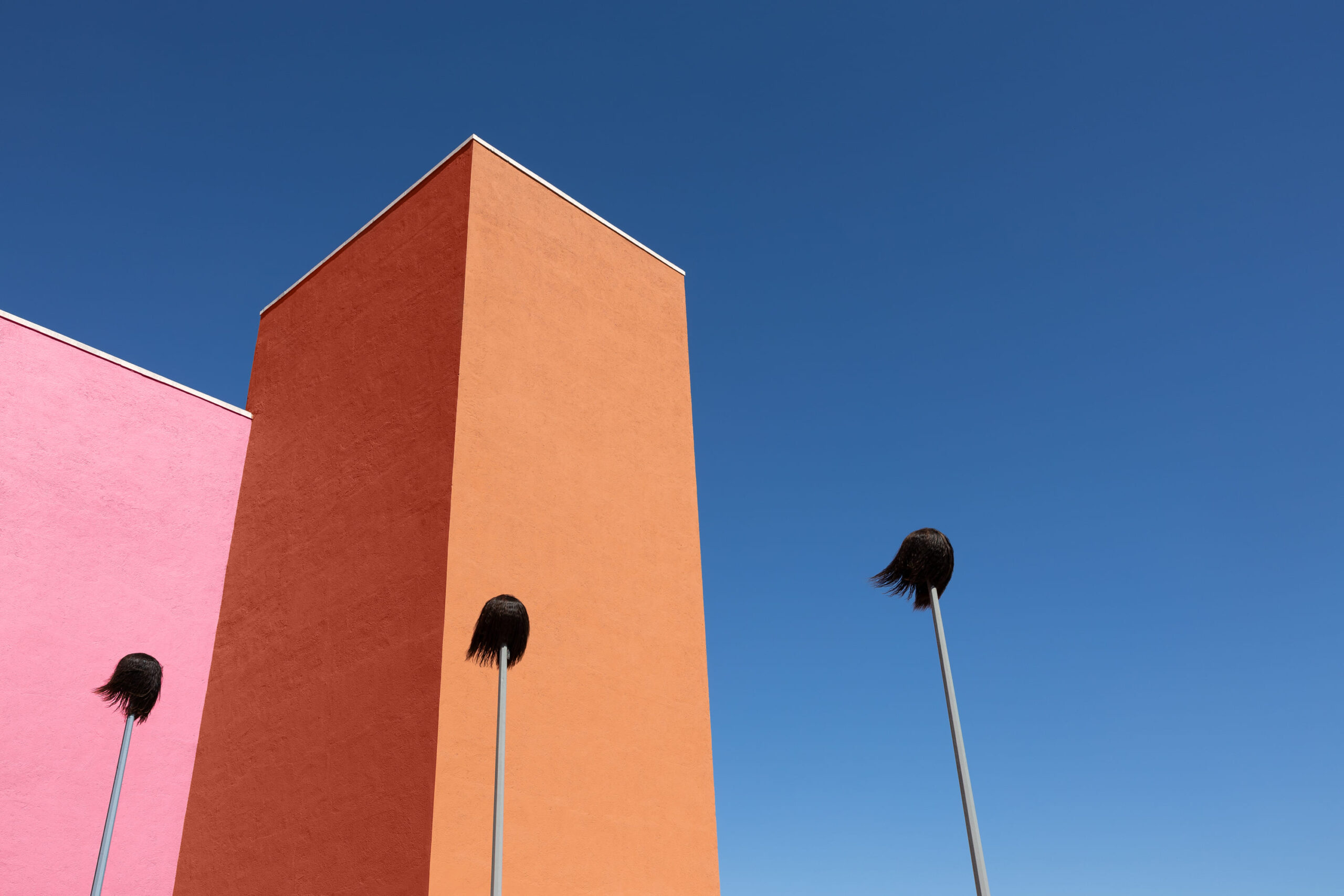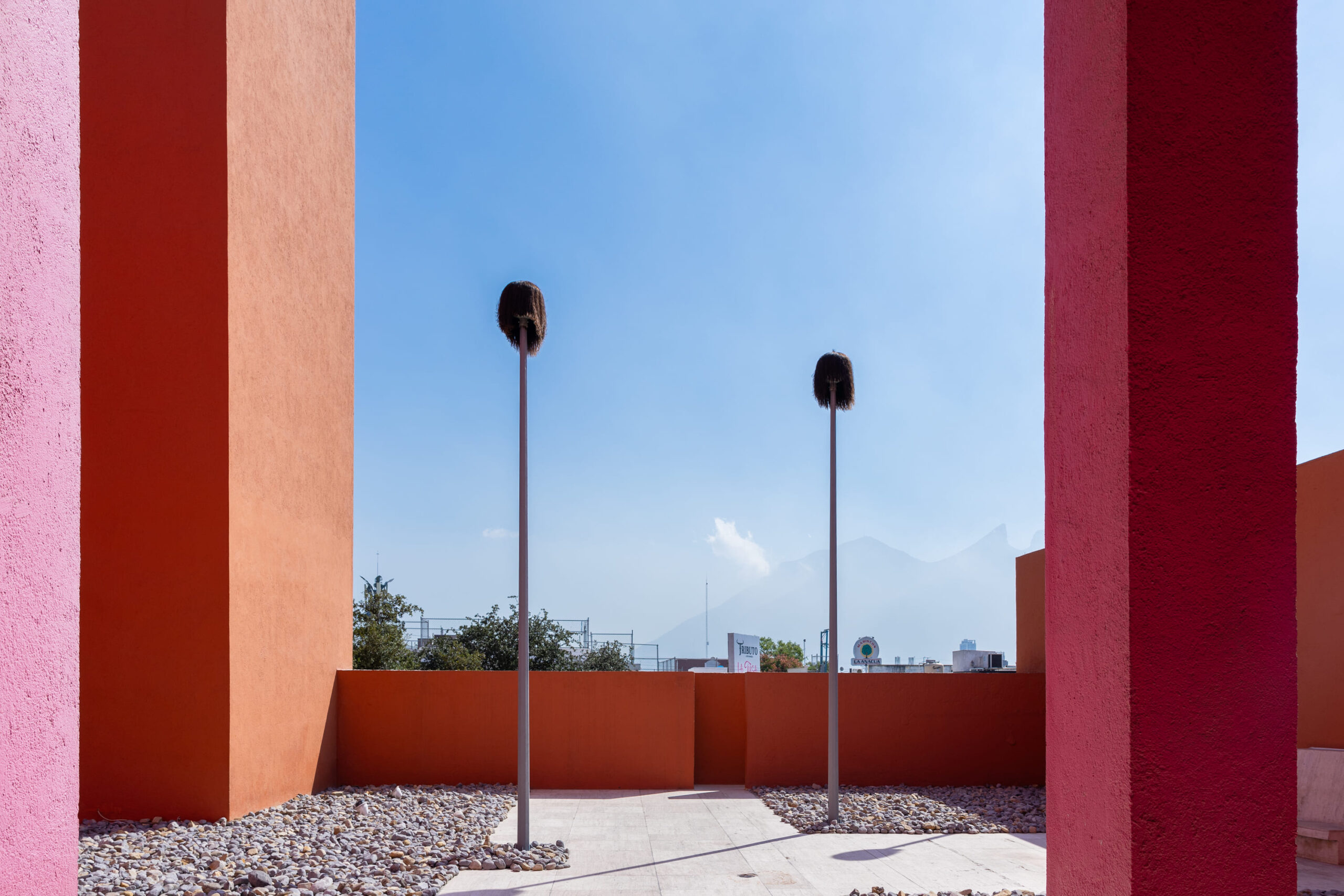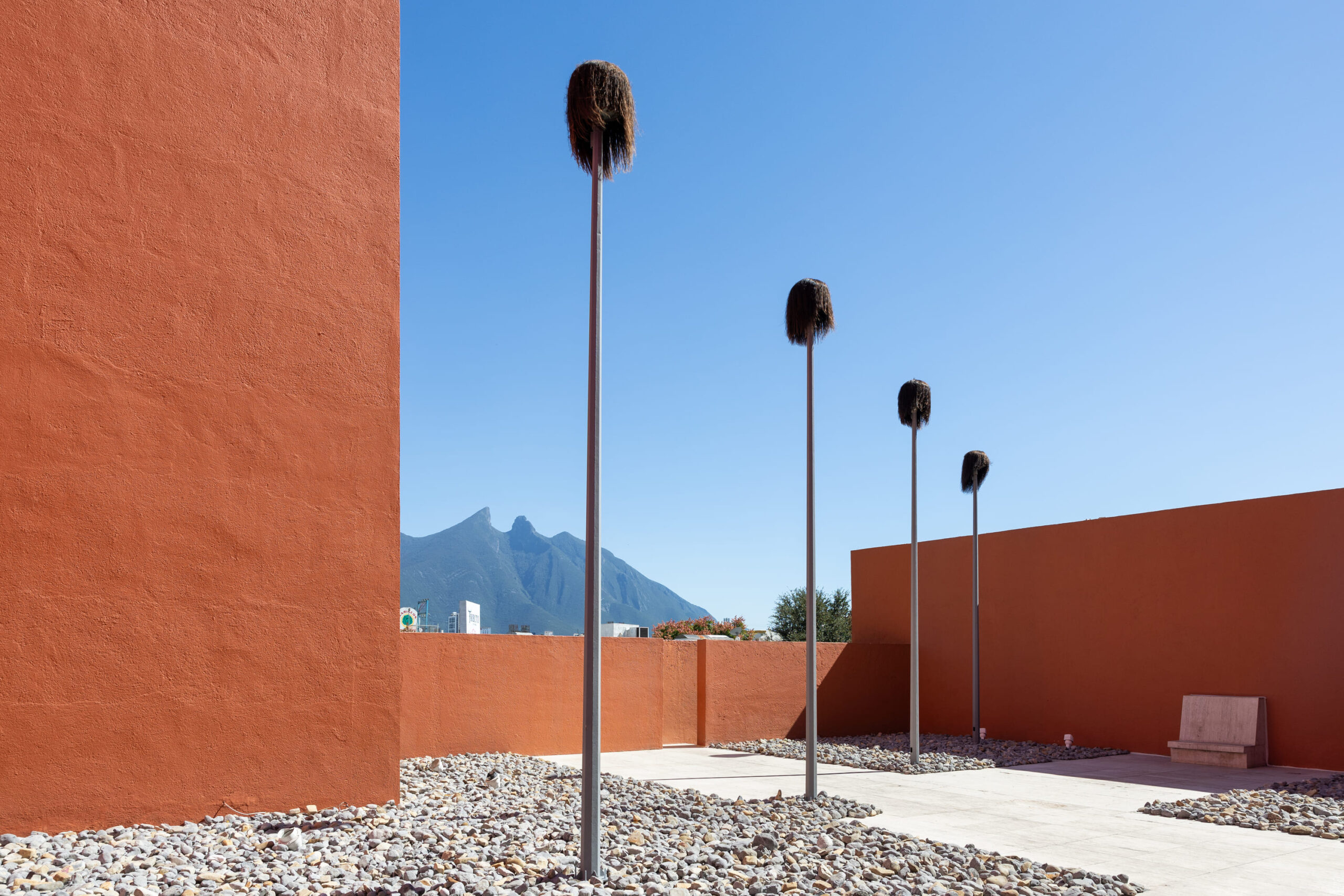 La obra se compone de cinco postes de luz, cada uno con una peluca de grandes dimensiones en la parte superior. Instalados en diagonal en Patio de las Esculturas, los postes visualmente tienen una dirección hacia el Cerro de la Silla, una icónica montaña de la Ciudad de Monterrey. También, por sus dimensiones, la obra se integra al paisaje al ser visible desde el exterior del recinto.