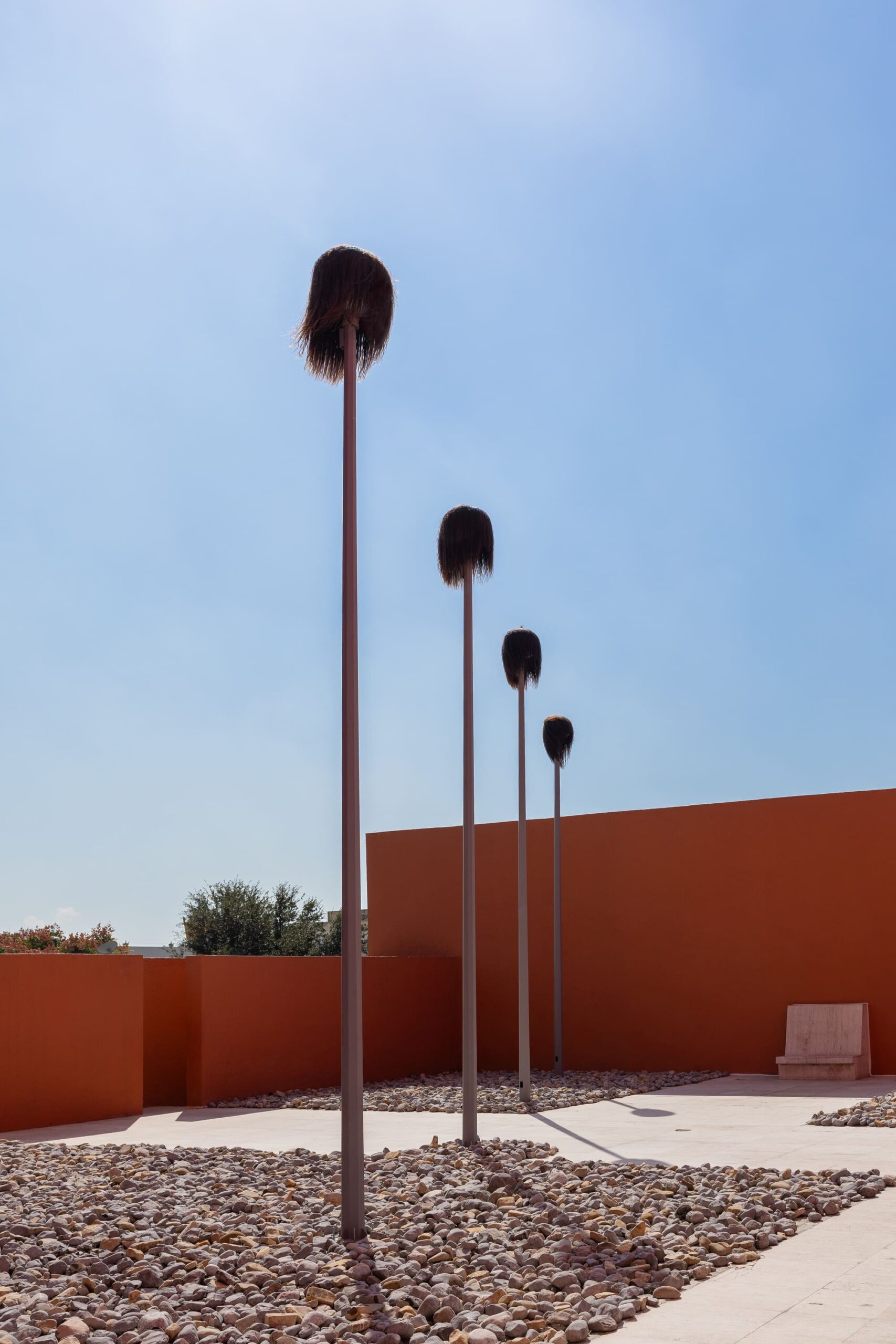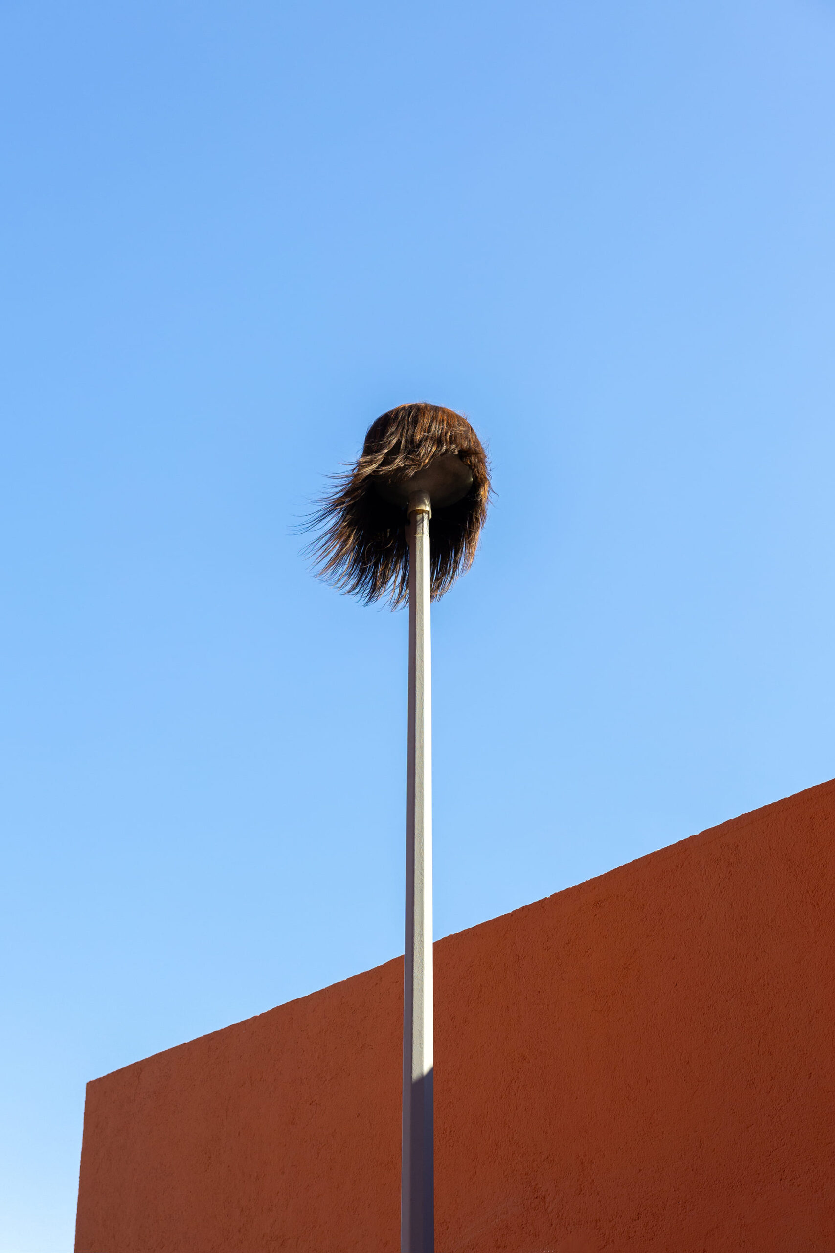 La instalación presentada en el Patio de las Esculturas del Museo de Arte Contemporáneo de Monterrey consiste en cinco postes de luz en desuso, coronados por pelucas gigantes de cabello humano que se erigen como extensiones del cuerpo performado de Isaac. Misteriosas y abstractas, estas esculturas cobran movimiento con el viento, sintetizando el proceso de reanimación que tuvo lugar en el performance en el que Olvera reactiva el rastro de Natasha Fuentes Lemus (1974–2005) a partir de las reflexiones sobre su vida. Las piezas ofrecen una doble lectura: por un lado, remiten a Olvera reanimando a Natasha como un autorretrato del artista; por otro, evocan el ir y venir de Fuentes Lemus entre la vida en la calle y su entorno cotidiano, rodeada de la élite literaria.
